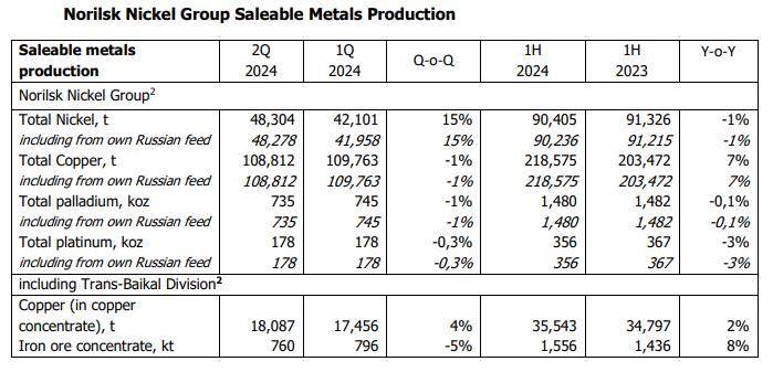 諾鎳表示,2024年上半年鈀金產量同比基本持平,而鉑金產量下降了3%。